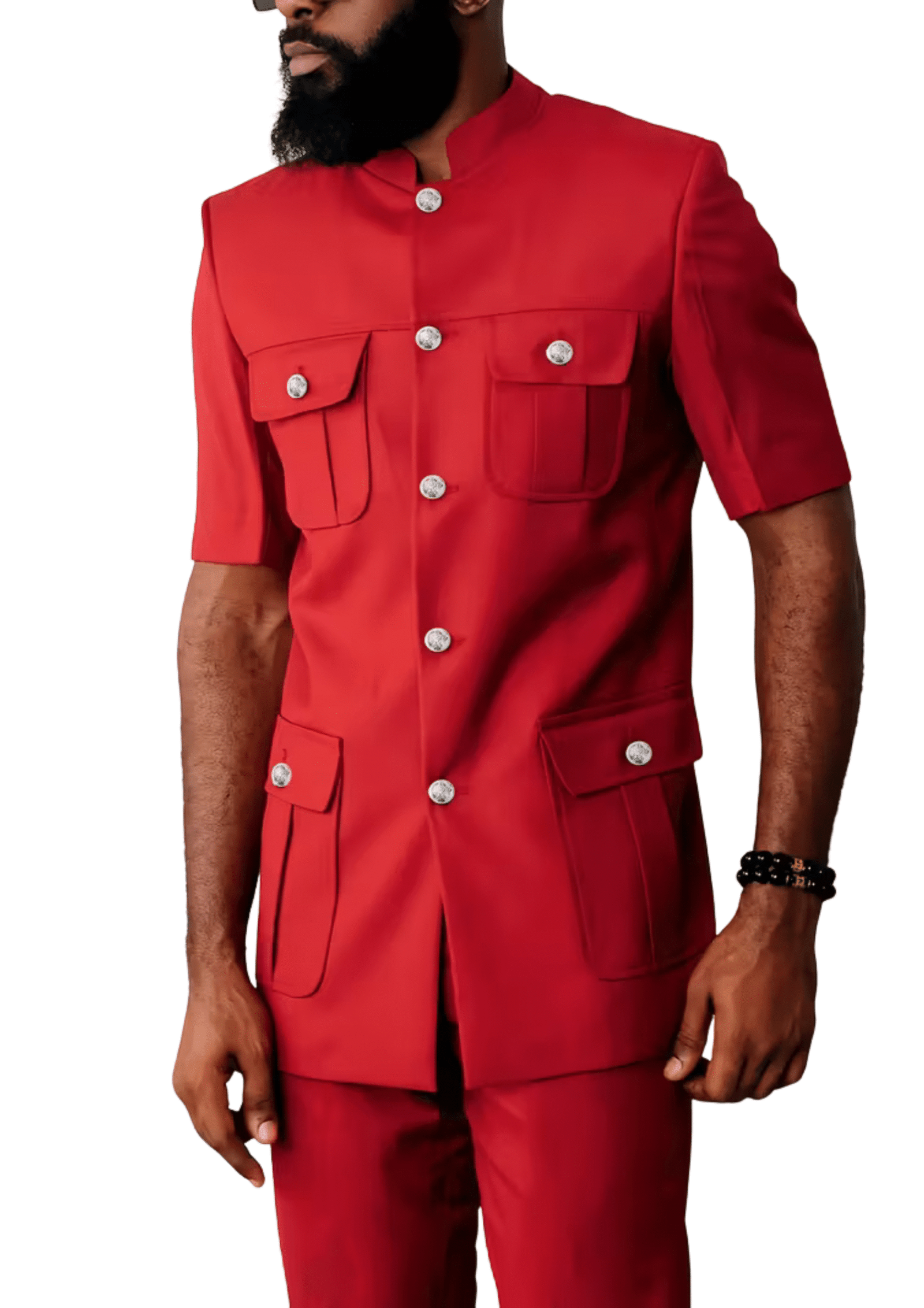 This bold red men’s traditional wear redefines modern elegance with a short-sleeve tailored top and matching trousers. Designed with functional front pockets and polished silver-tone buttons, it combines practicality with standout style. Crafted from high-quality breathable fabric, the outfit ensures comfort while maintaining a structured, refined fit. Ideal for weddings, engagements, cultural ceremonies, or evening celebrations, this two-piece set is perfect for men who appreciate bold fashion that blends tradition with contemporary sophistication.