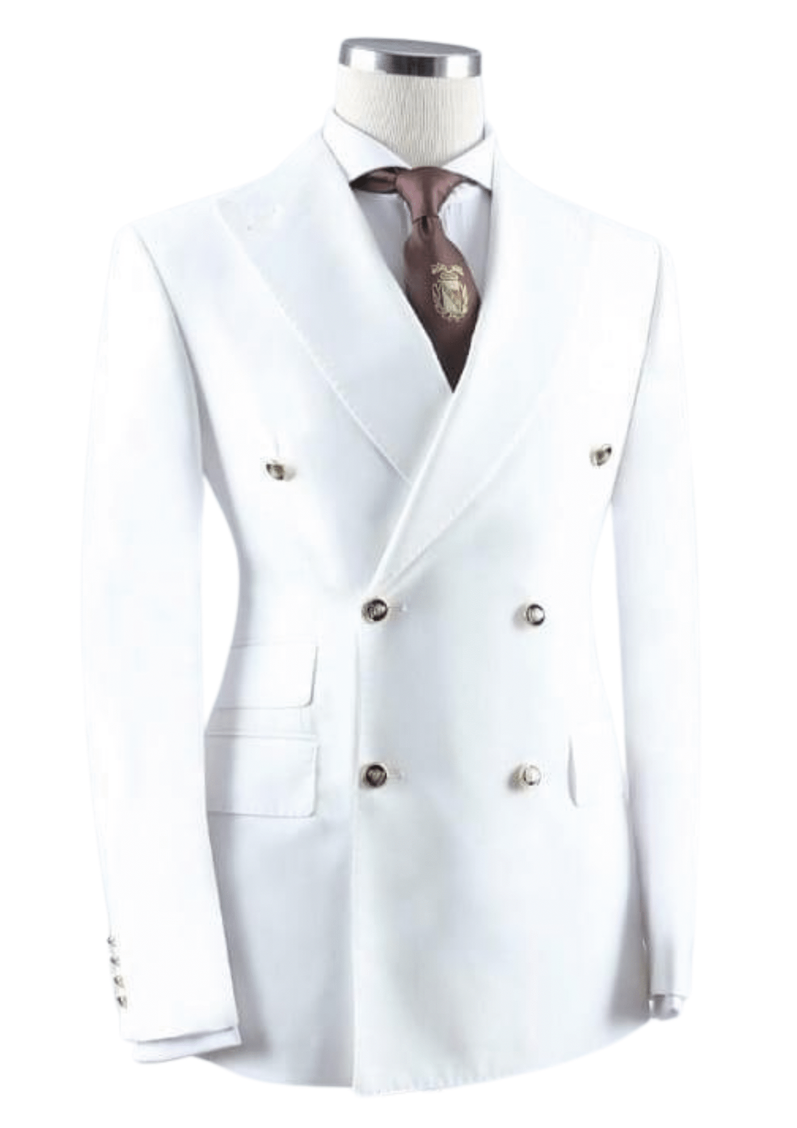 The crisp white fabric exudes confidence and refinement, while the double-breasted cut with a slim silhouette ensures a commanding presence. Paired with a white dress shirt, a silk tie, and formal trousers, this blazer delivers an unforgettable statement look.