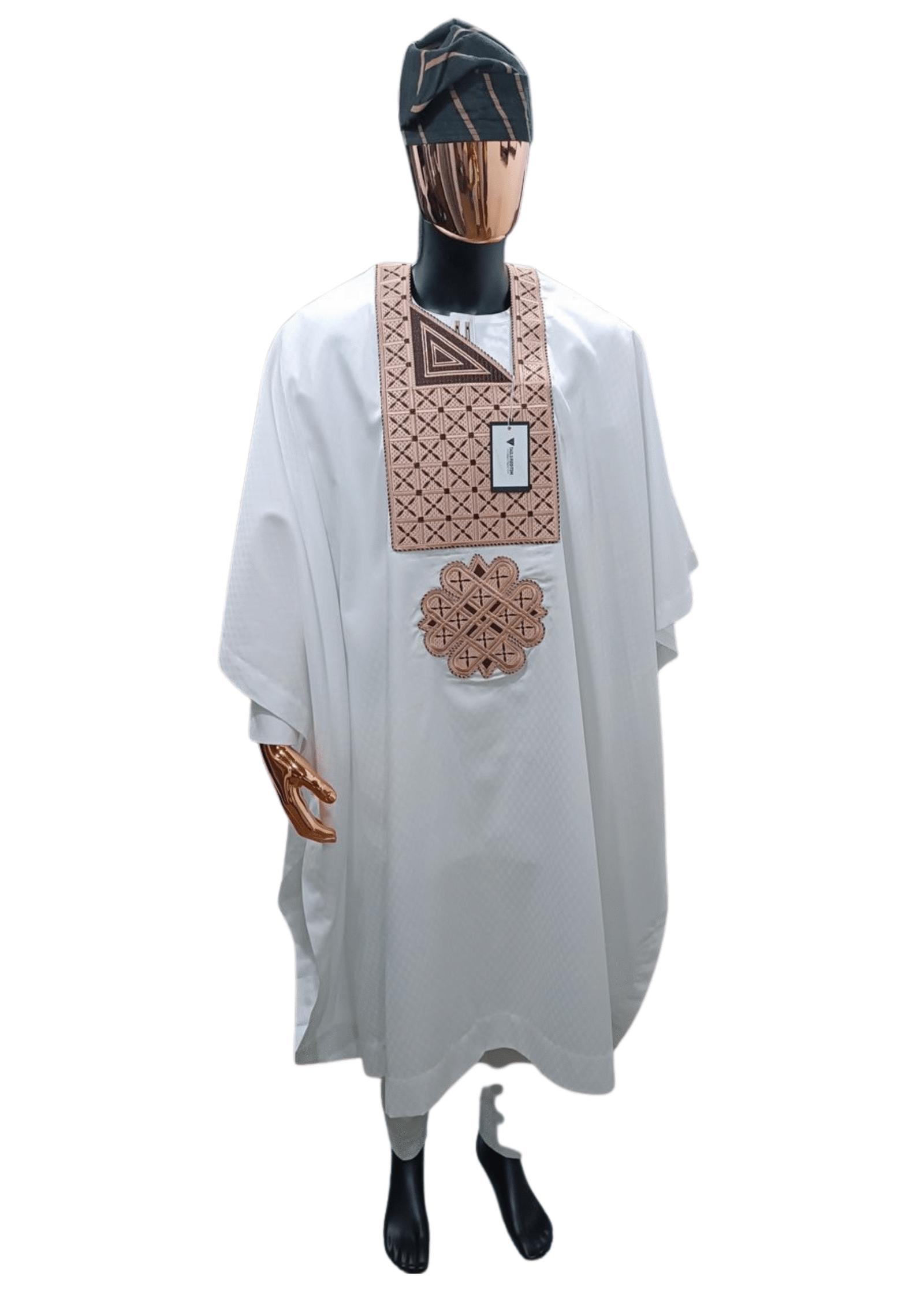 Step into regal sophistication with this elegant white agbada, designed for men who appreciate timeless African fashion. Tailored from high-quality cotton blend fabric, it features exquisite brown geometric embroidery on the chest and a matching fila (cap) for a complete traditional look. The loose, flowing fit ensures comfort and elegance, making it ideal for weddings, naming ceremonies, religious events, and festive gatherings. This agbada perfectly blends traditional craftsmanship with modern style, ensuring you stand out at every occasion.