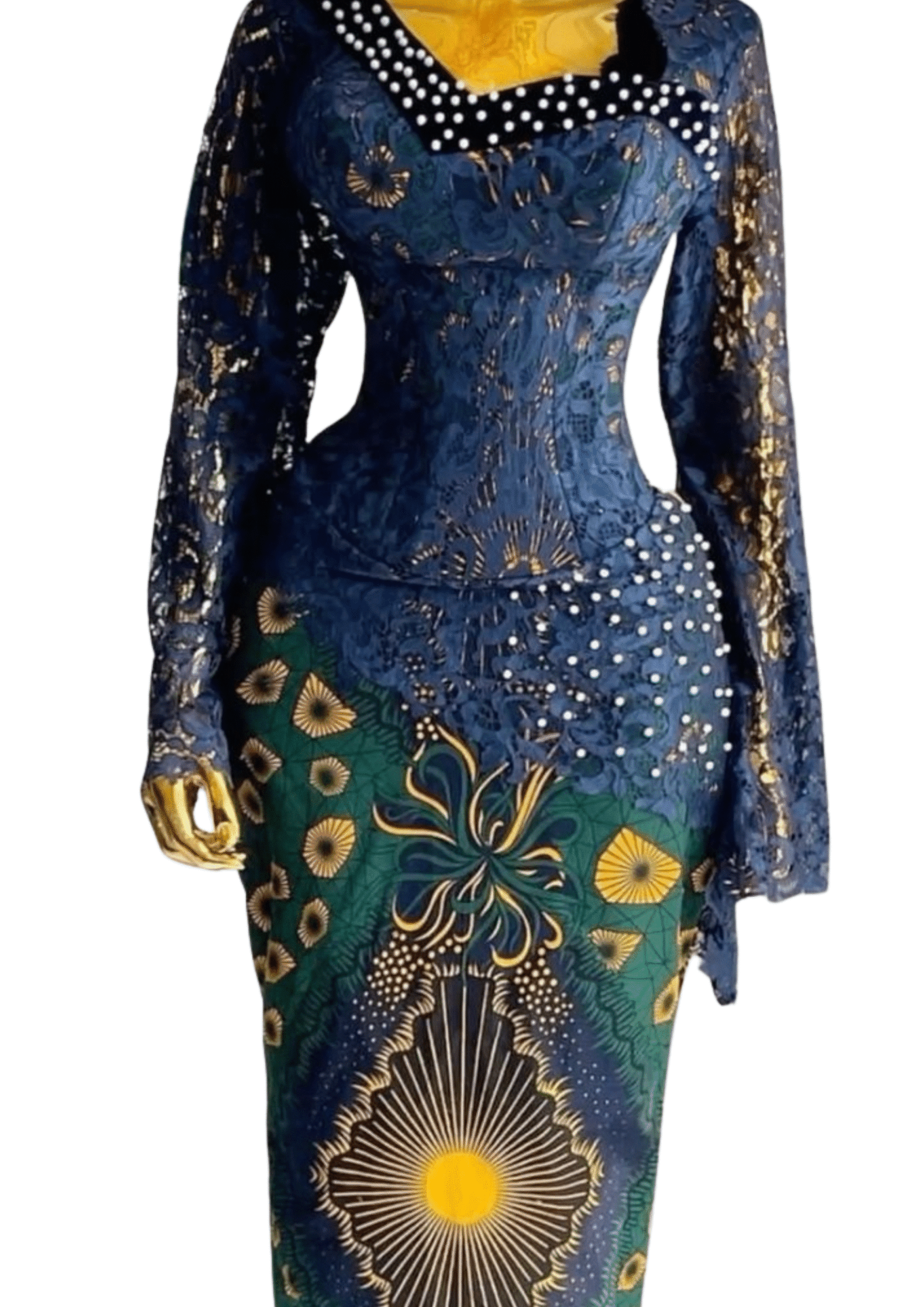 This exquisite ensemble combines the richness of traditional Ankara with the refinement of delicate lace, creating a striking harmony of textures. The fitted bodice is carefully tailored to highlight the waistline and is adorned with intricate bead embellishments that add a touch of brilliance.