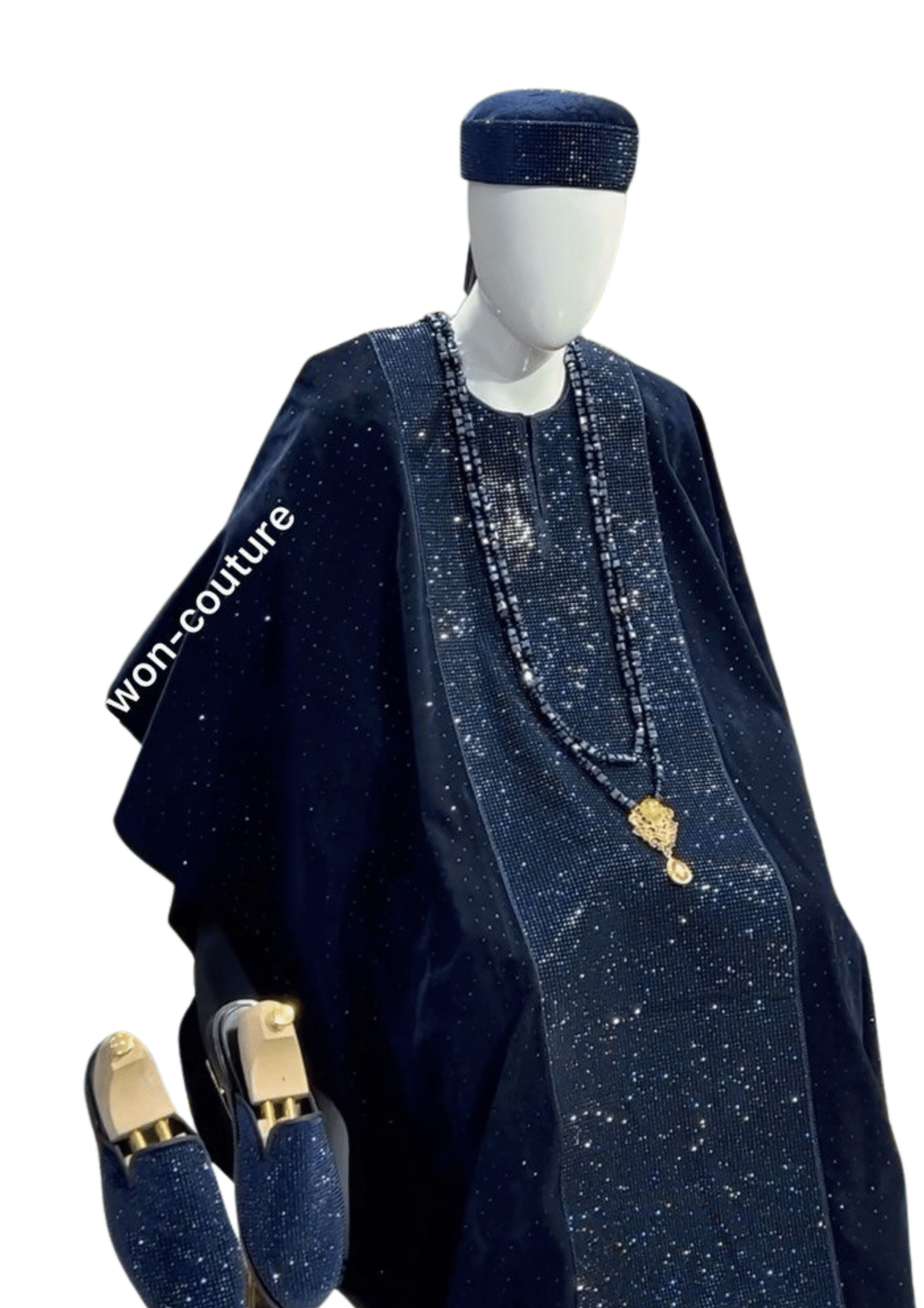 This luxury navy blue agbada set redefines traditional wear with a touch of modern sophistication. Expertly tailored from high-quality fabric, it features dazzling crystal embellishments that shimmer under light, giving the outfit a regal and commanding presence. The set comes complete with a coordinating cap and stylish loafers, ensuring a polished and harmonious look from head to toe. Ideal for weddings, cultural ceremonies, receptions, and festive celebrations, this agbada offers both comfort and grandeur. Designed for men who appreciate fine detailing and cultural elegance, it guarantees admiration and distinction at every event.