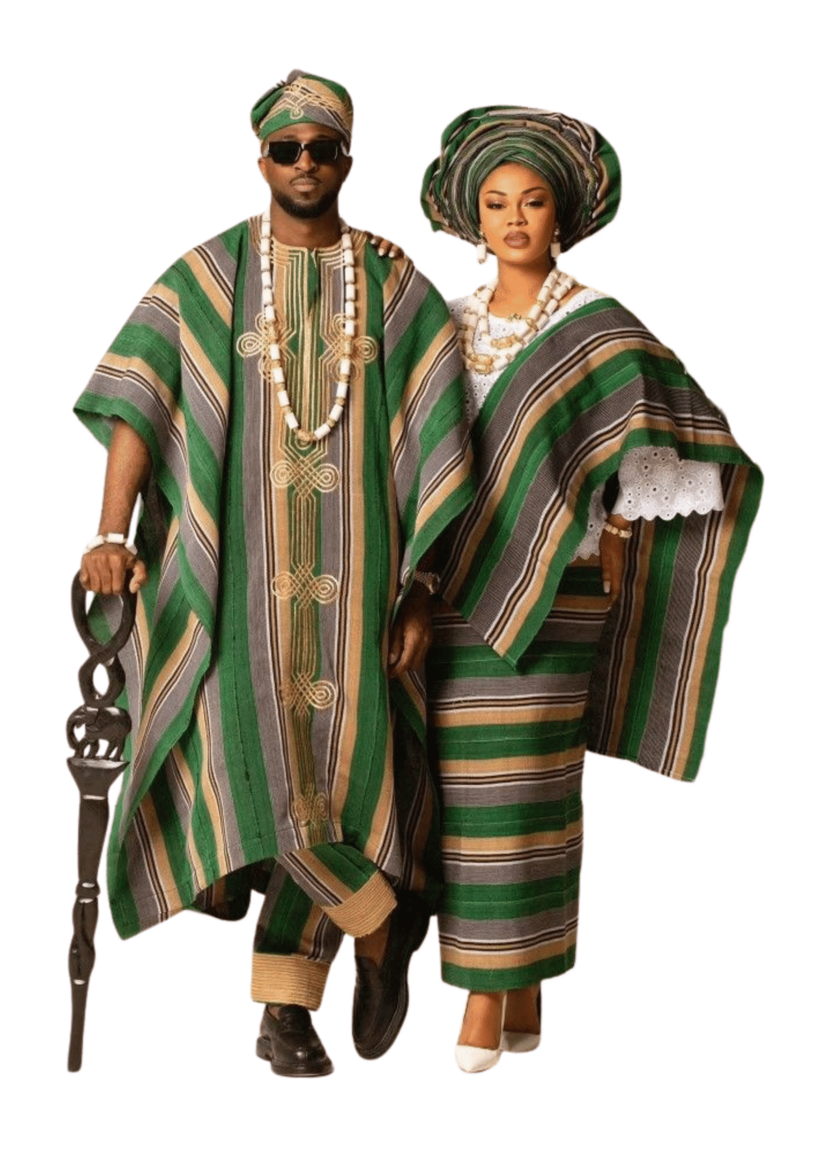 This elegant his-and-hers traditional set is designed for couples who want to showcase unity, culture, and sophistication. Crafted from premium woven fabric with striking green, gold, and gray stripes, the set includes a flowing agbada with fila cap for men, and a graceful iro-buba wrapper blouse combination with matching gele for women. The high-quality material ensures durability, comfort, and a distinguished appearance. Perfect for weddings, traditional engagements, anniversaries, or cultural festivities, this attire makes couples stand out with timeless elegance and royal flair.