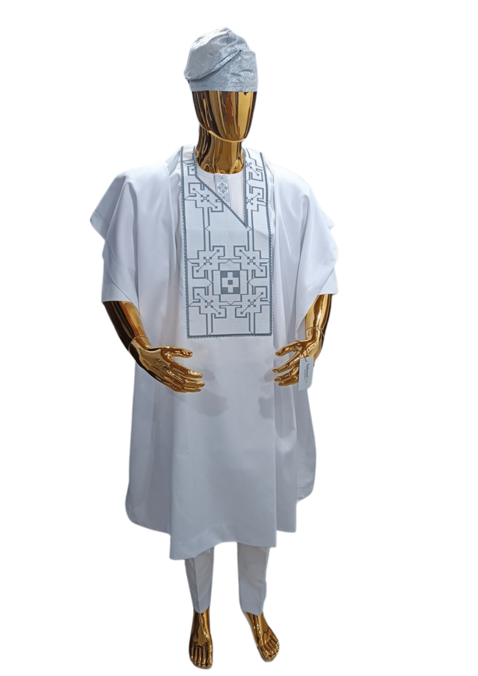 • Complete 3-piece set: Agbada, inner wear, trousers, and fila cap