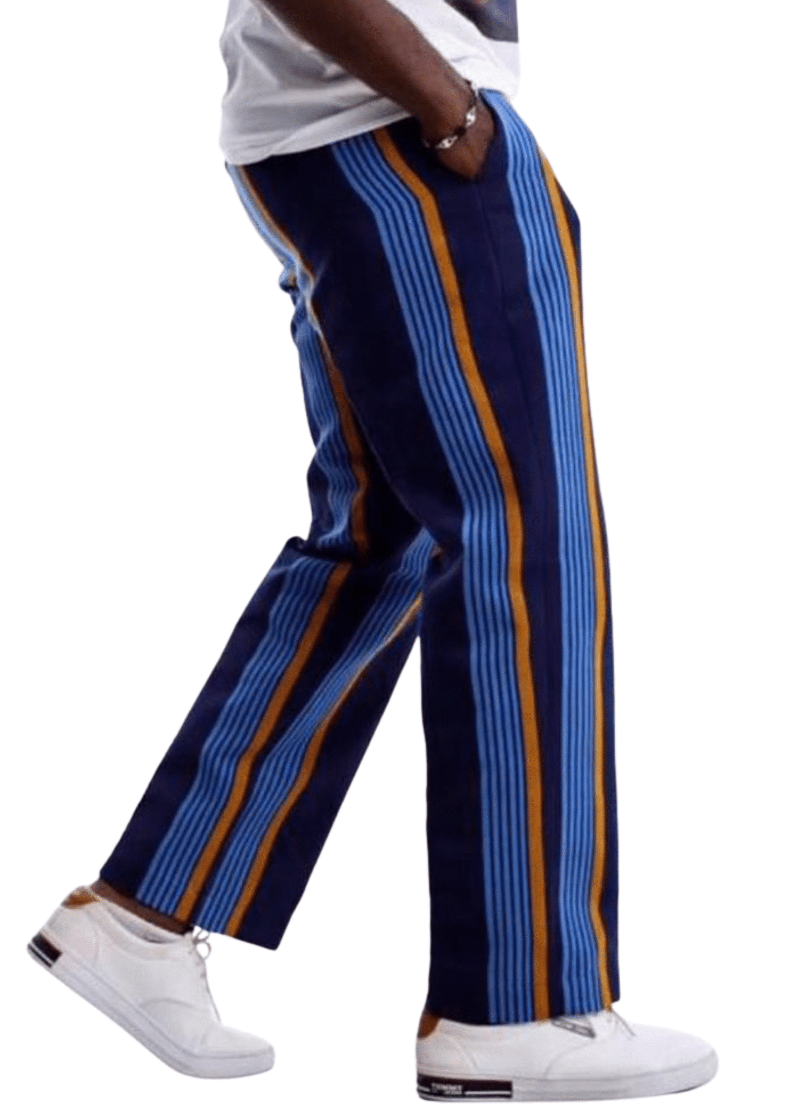 These trousers feature a modern take on traditional styling with vertical blue and mustard stripes that elongate the frame and create a bold, confident look. Crafted for both comfort and statement-making style, they can be worn casually with sneakers or paired with traditional tops for cultural occasions. A versatile piece that blends heritage with contemporary fashion.